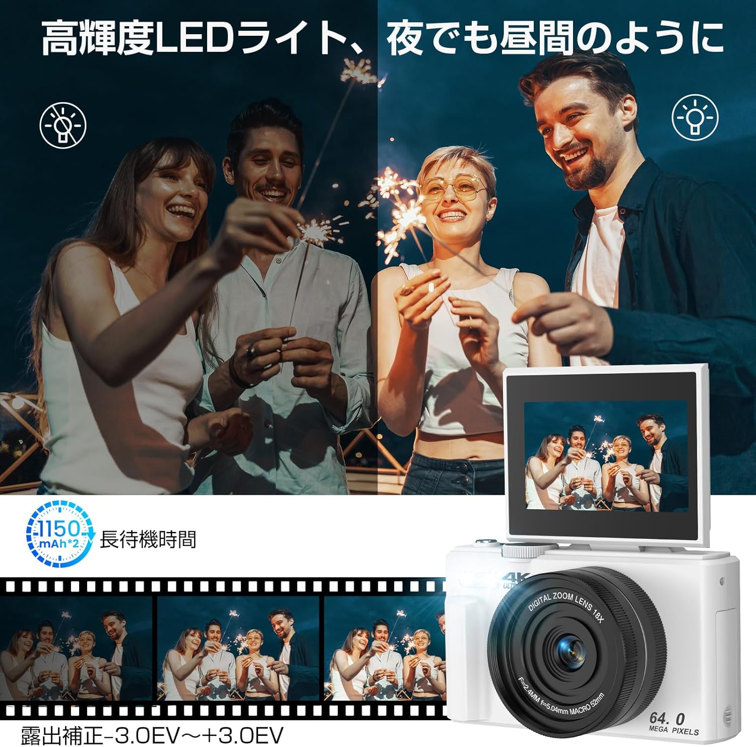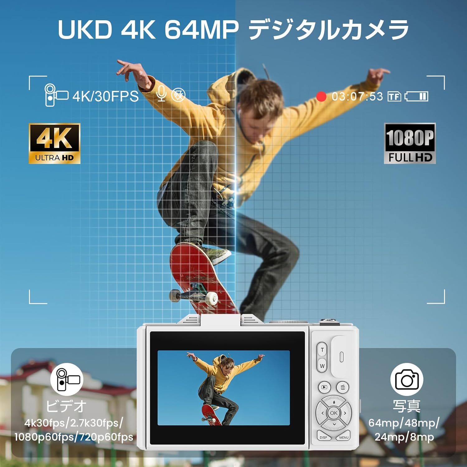 4K動画撮影 6400万画素 デジカメ コンパクト オートフォーカス 3.0インチ大画面 軽量 修学旅行 学生 初心者 32GB Micro SDカード付属 1200mAhバッテリー2枚入り日本語取扱書付き ホワイト