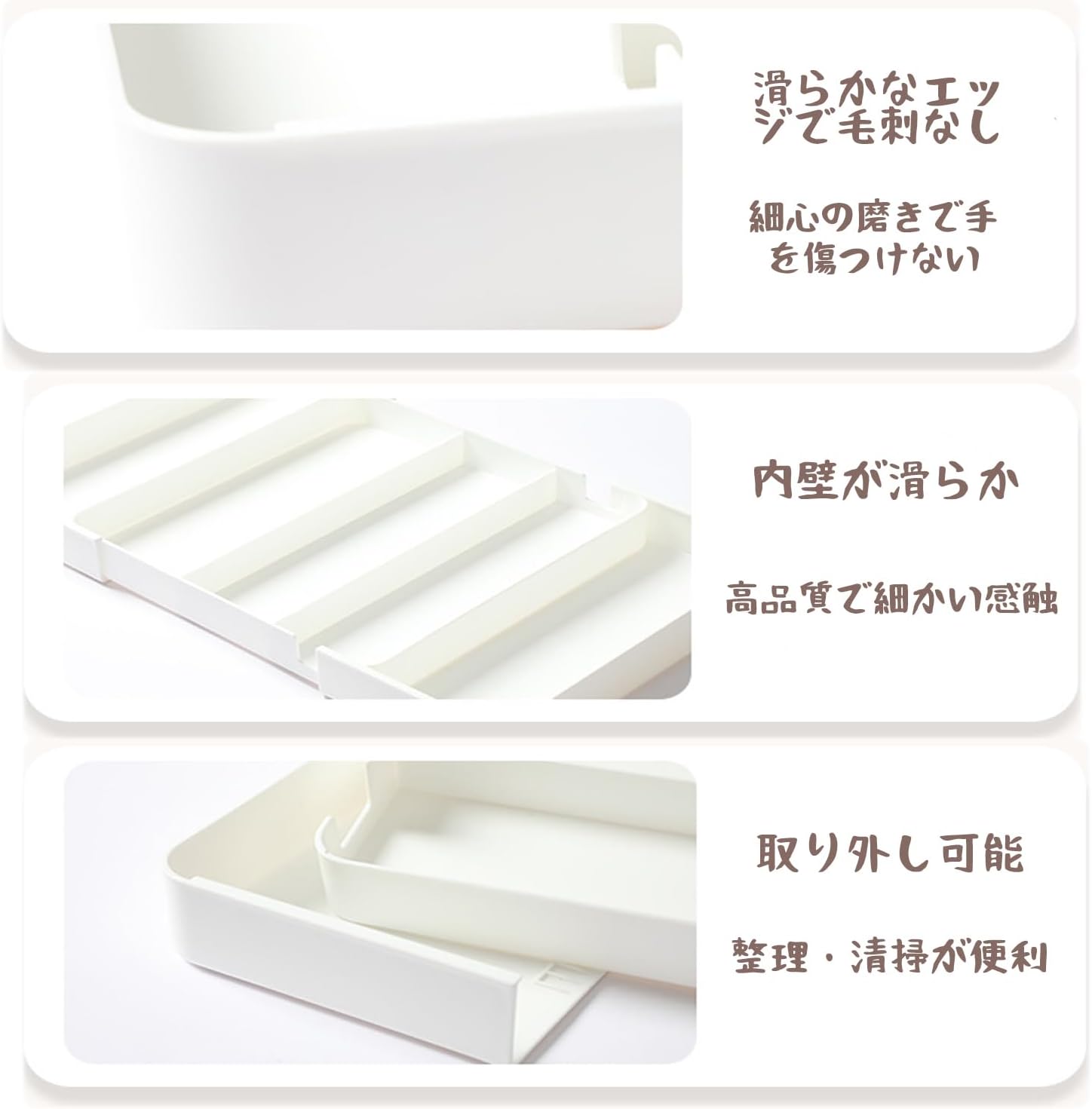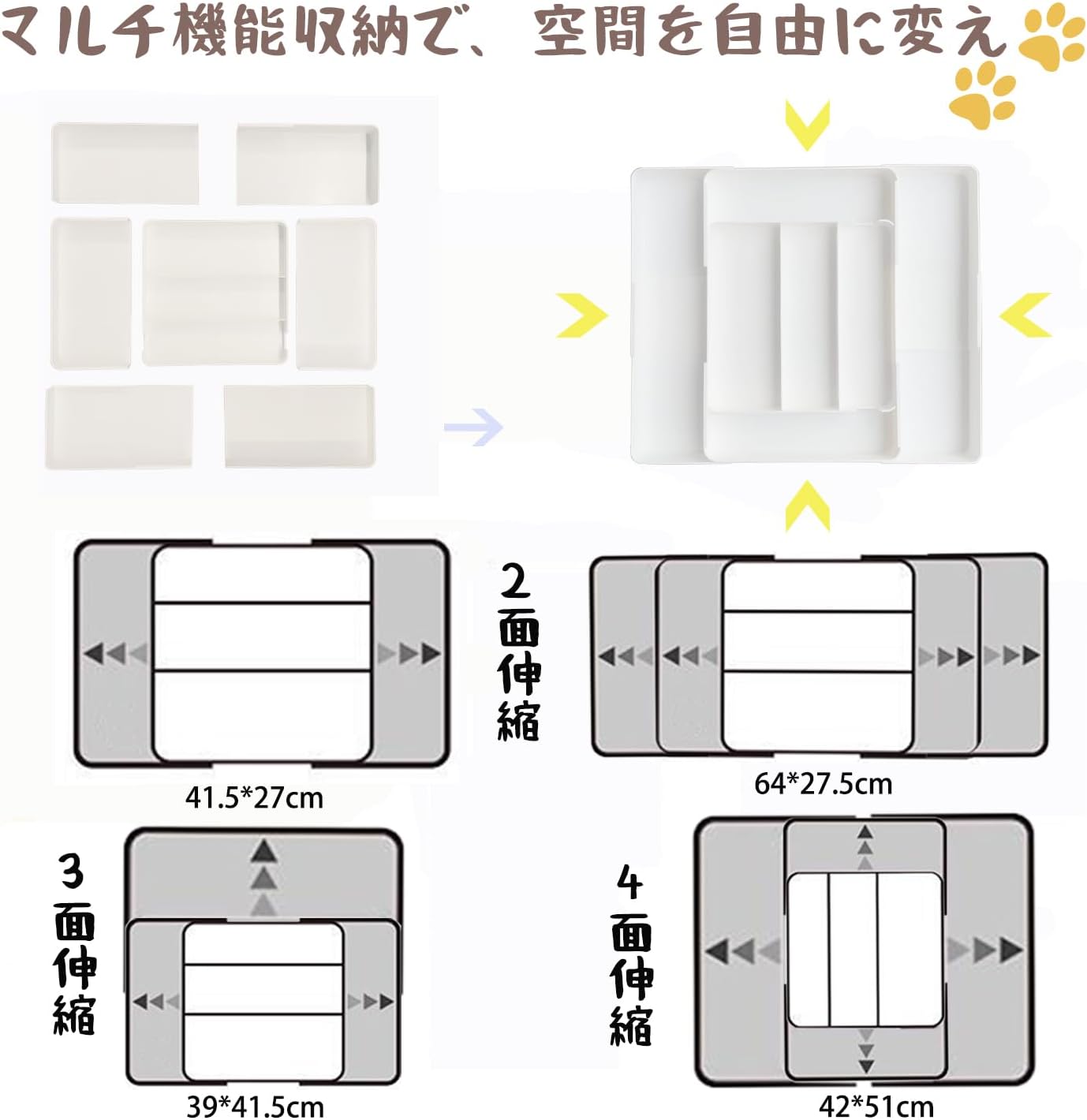 4面伸? スライド カトラリー収納 約W27~51×D27~51×H5 文房具・化粧品・小物 引き出し 仕切り お手入れ簡単 キッチン 引き出し 取外し可能 (白い)