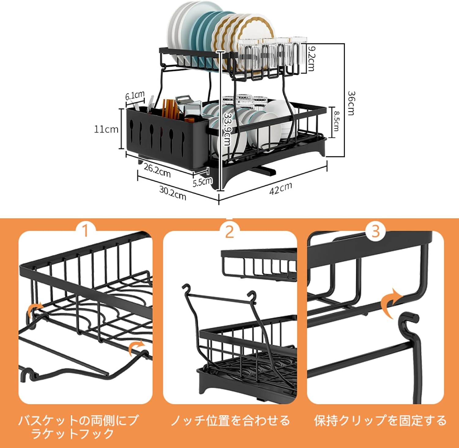 横置き 水切りかご 錆びない 2段式 自動排水 大容量 ディッシュラック キッチン収納 水が流れる 食器乾燥 皿立て 箸収納 包丁スタンド まな板立て 組み立て簡単 (Bタイプ(31*44*33cm), ブラック)