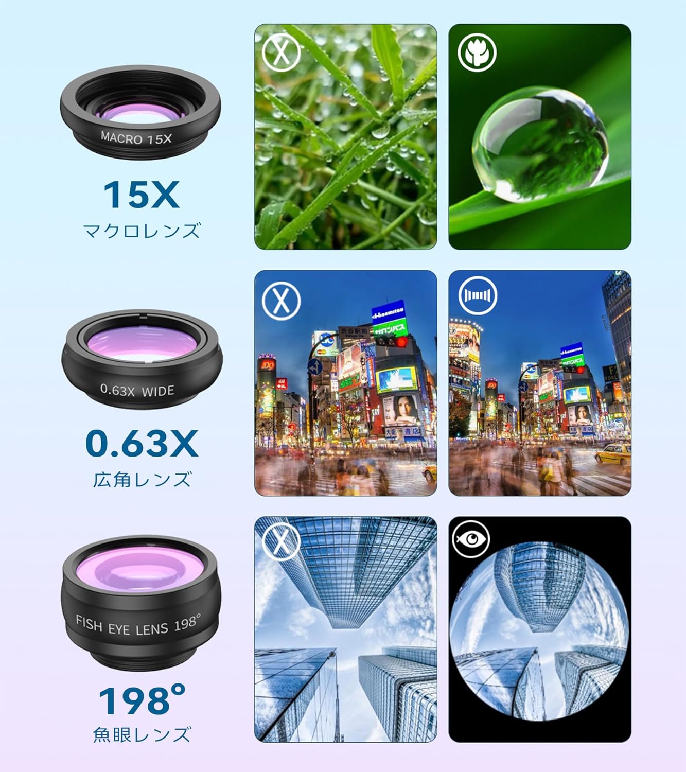 魚眼レンズ/広角レンズ/マクロレンズ 4in1スマホレンズセット