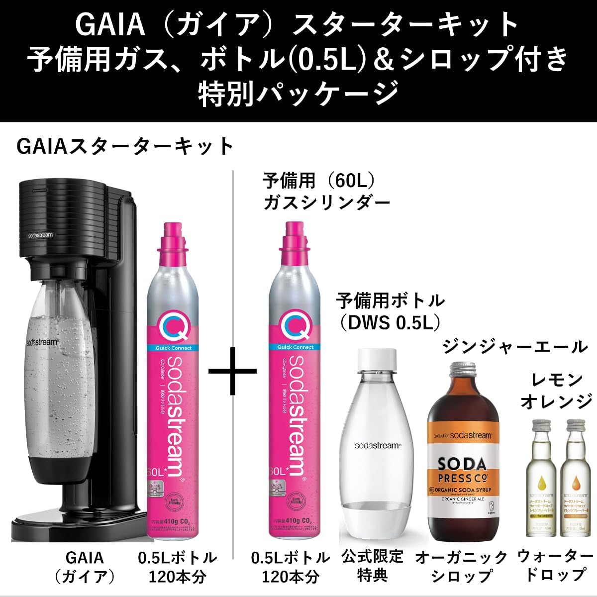 シロップ1種 ウォータードロップ2種 60L用ガスシリンダー 電源不要 食洗器対応ボトル ワンタッチガス交換 ソーダメーカー