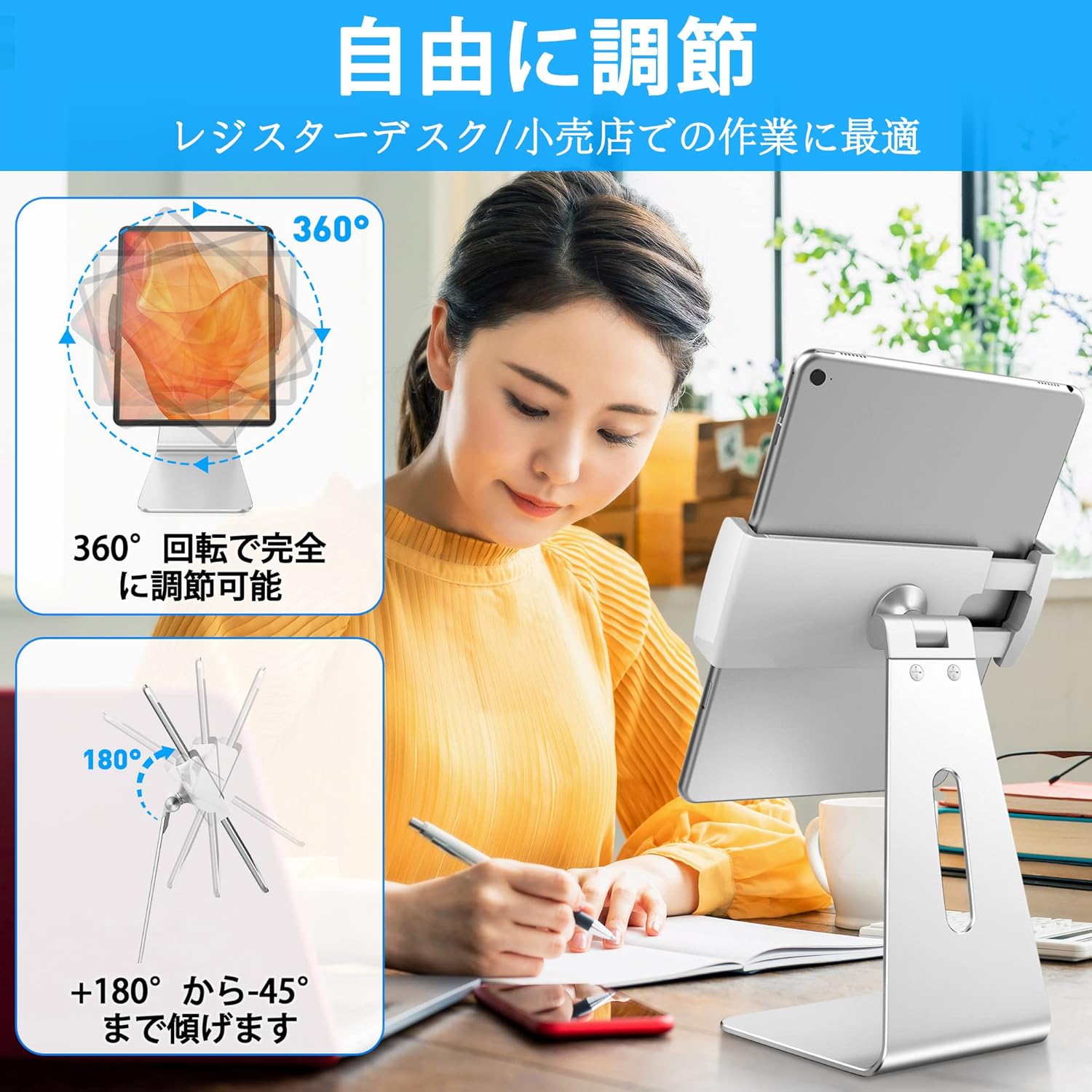 シルバー | 360°回転 | 折り畳み | 高さ&角度調整 | 充電対応 | 人間工学設計 | 対応7〜13インチ