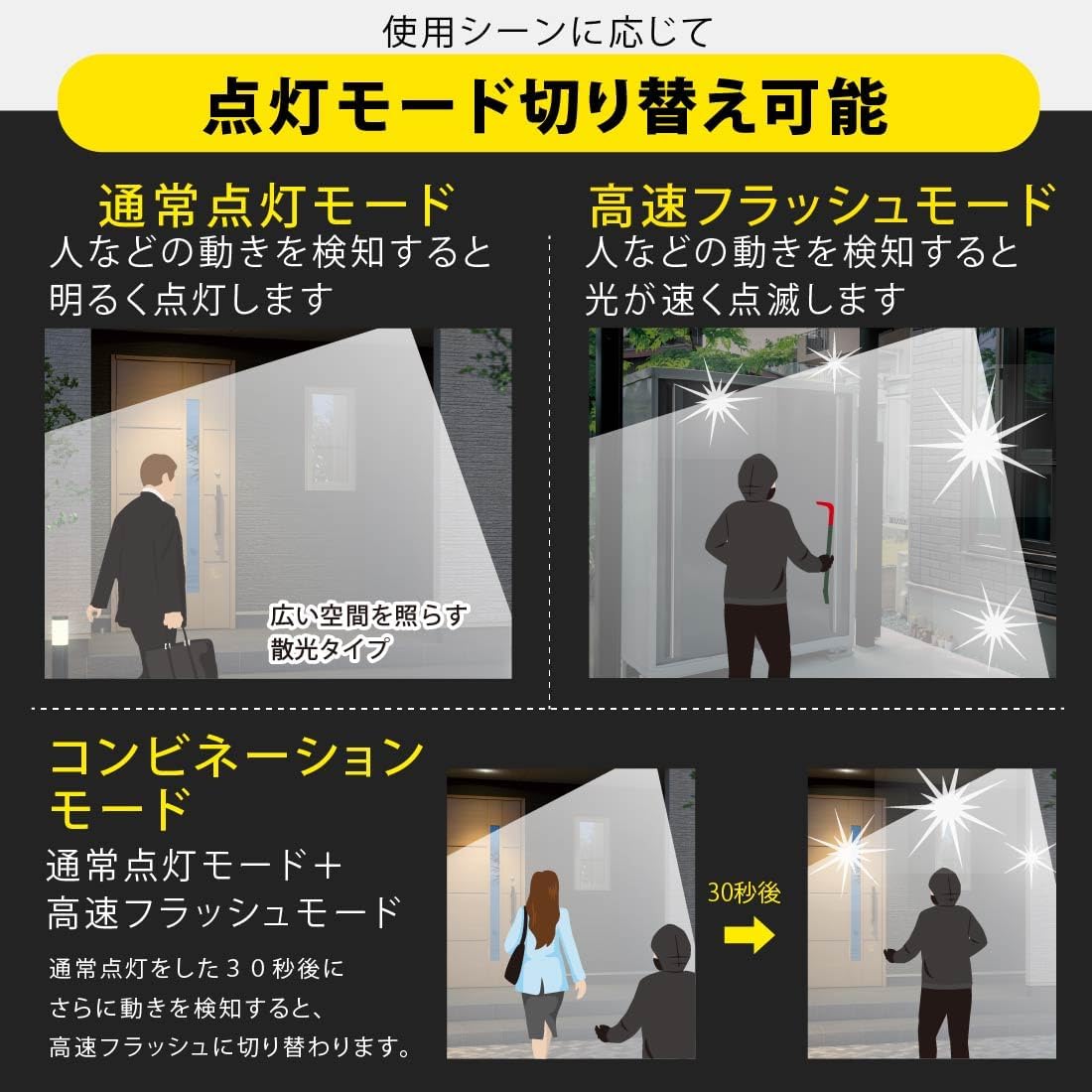 力な明るさ4500ルーメン ※当社電池式センサーライト比 ◆高速フラッシュ点滅で不審者に警告、不審者の存在を周囲に知らせます