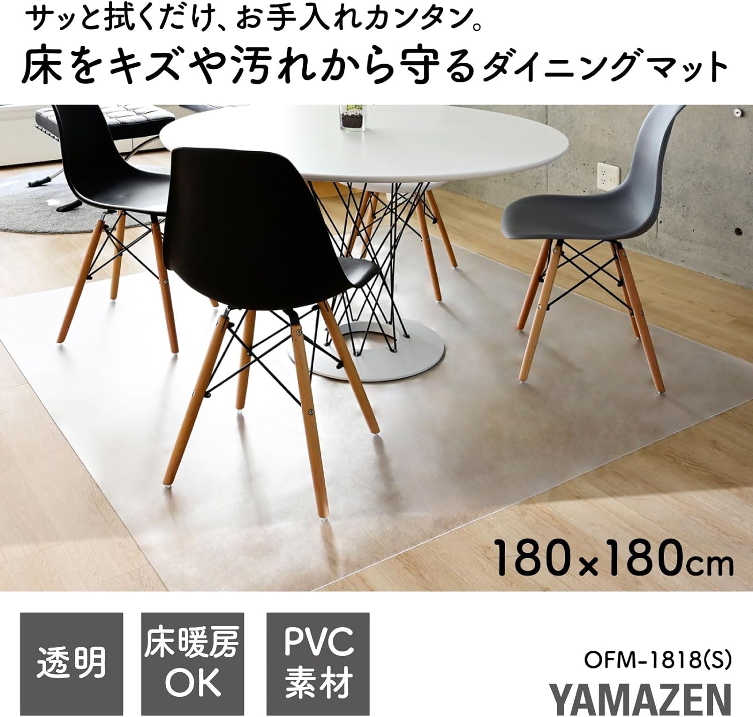 床をキズや汚れから守るダイニングマットです。お部屋のイメージをそこねにくいクリア素材です。