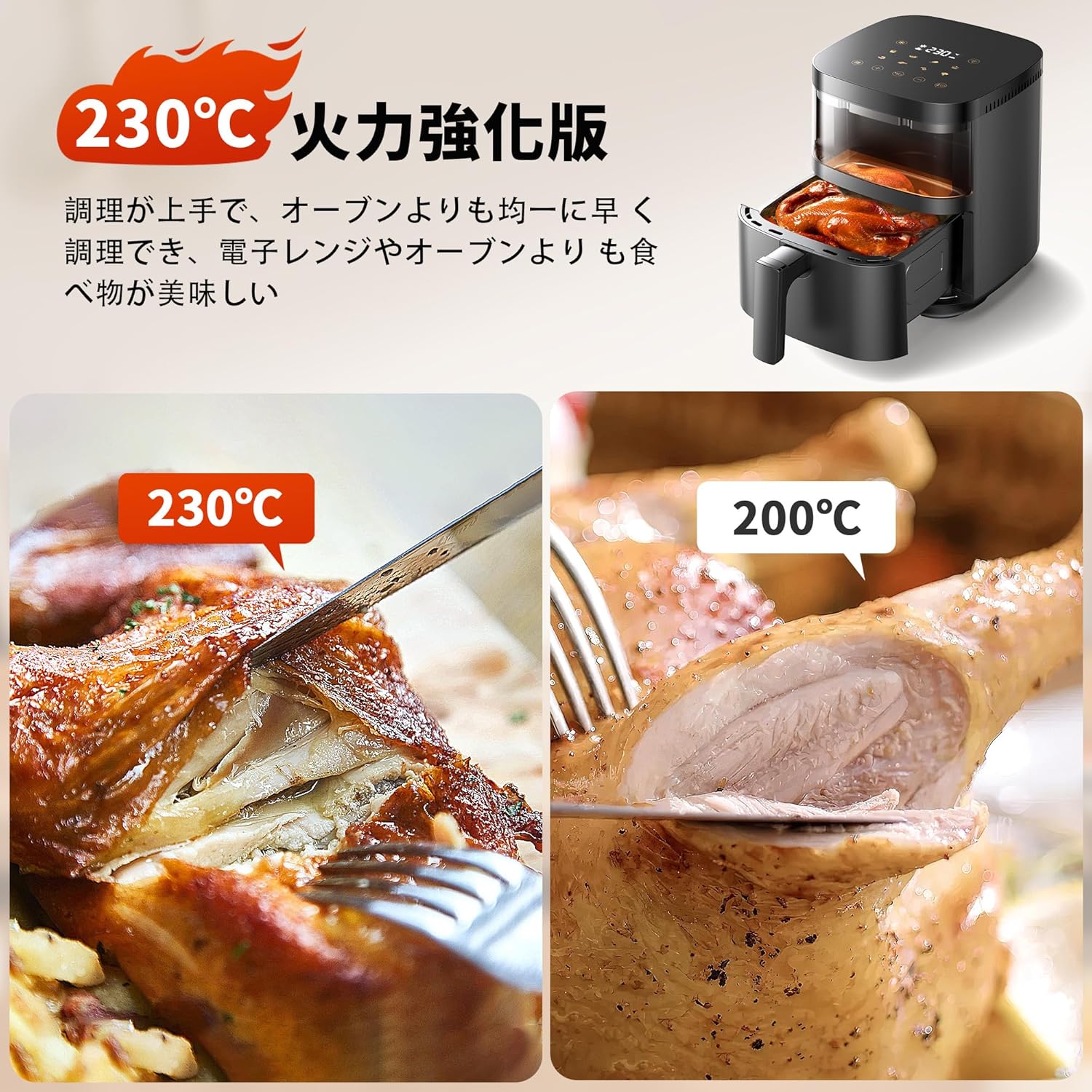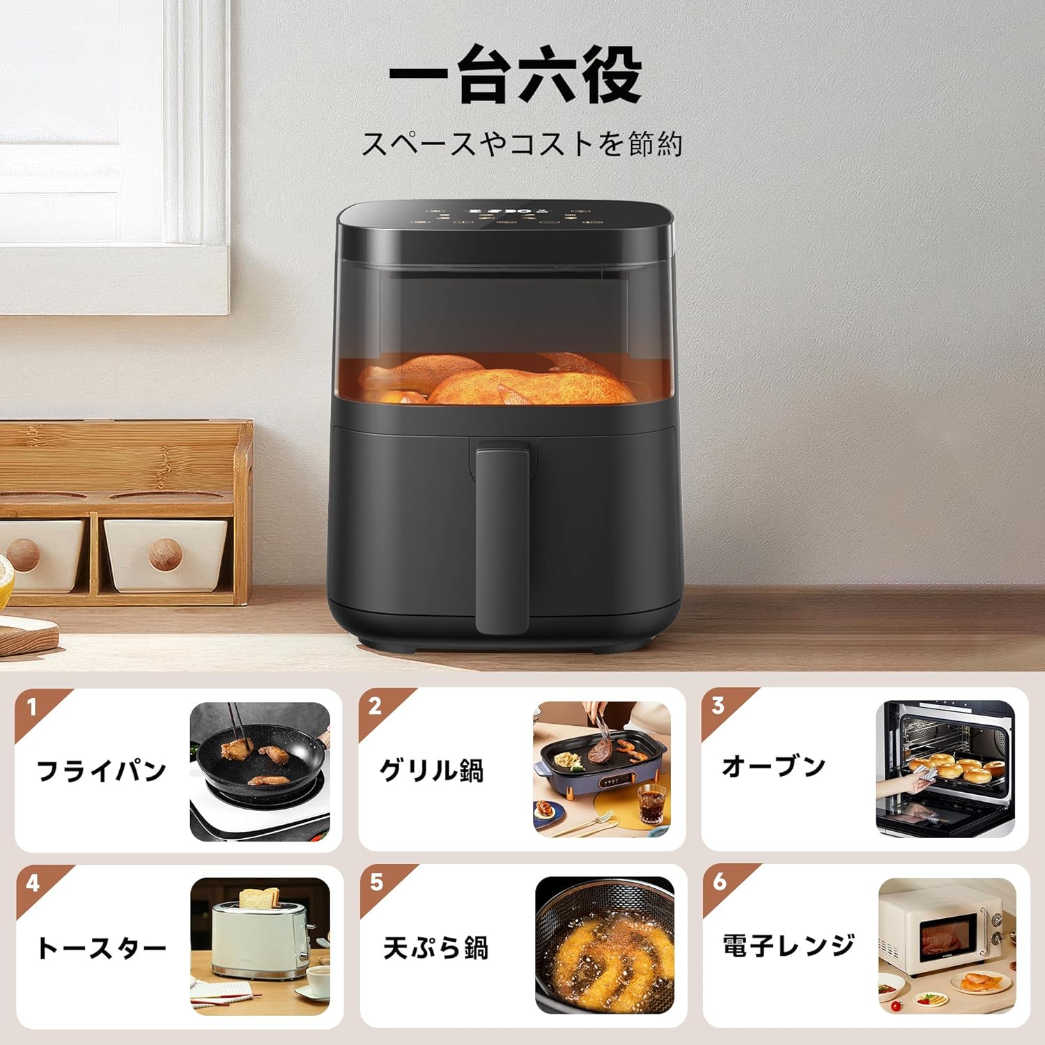 ノンオイルフライヤー エアフライヤー 1-5人用 可視窓 大容量 家庭用 省エネ 最高温230℃ ノンフライヤー機 LEDディスプレイ 日本語レシピ付き タイマー 自動電源オフ