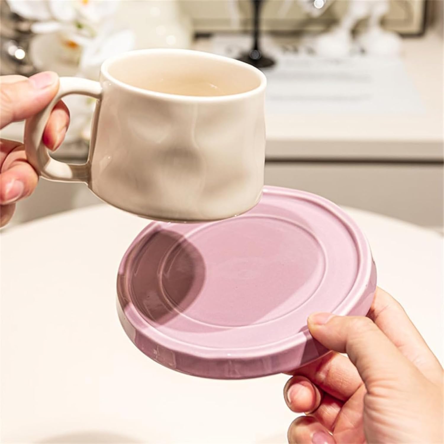 セラミックカップ マグカップ カップ コーヒーカップ ミルクカップ カップルカップ プレートフレンチ かわいい プレゼント (パープルコーヒーマグ+ホワイトカップ&ソーサー)