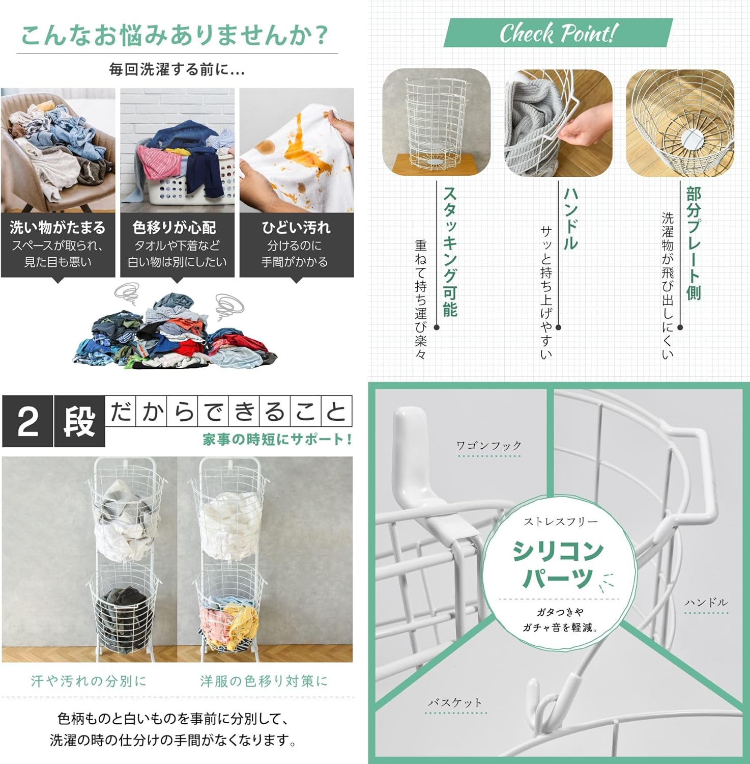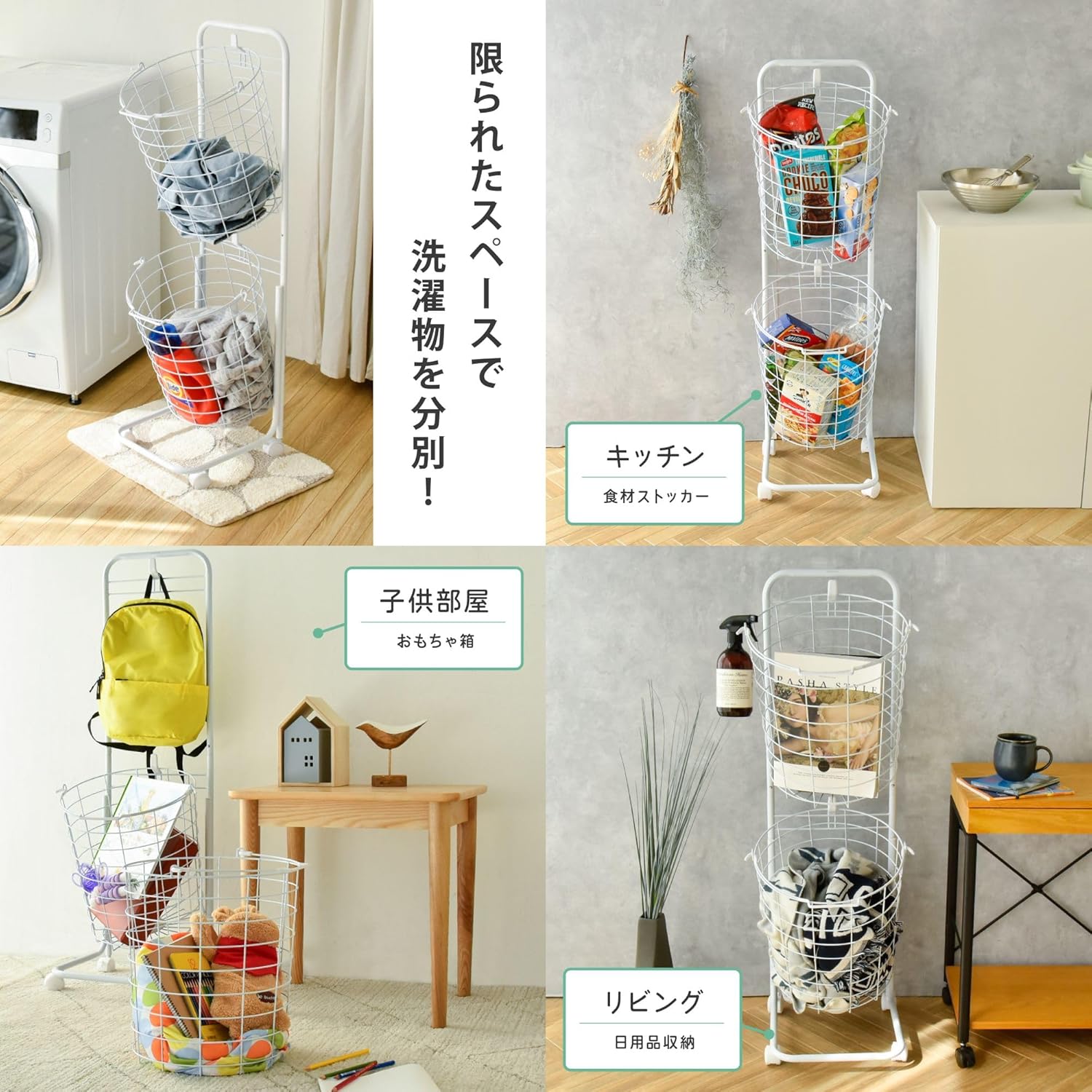 2段 キャスター付き 丸型 大容量 25L+25L 省スペース ハンドル付き 洗濯カゴ 洗濯物かご ランドリーワゴン ランドリーラック 鉄製 モダン おしゃれ 新生活