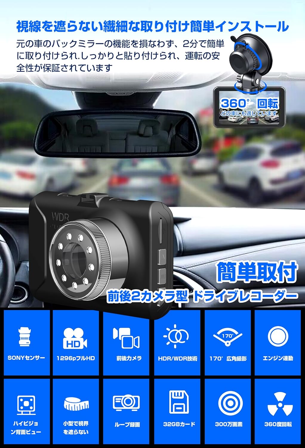 前後2カメラ ドラレコ 1296P 170度超広角 32GBカード付き