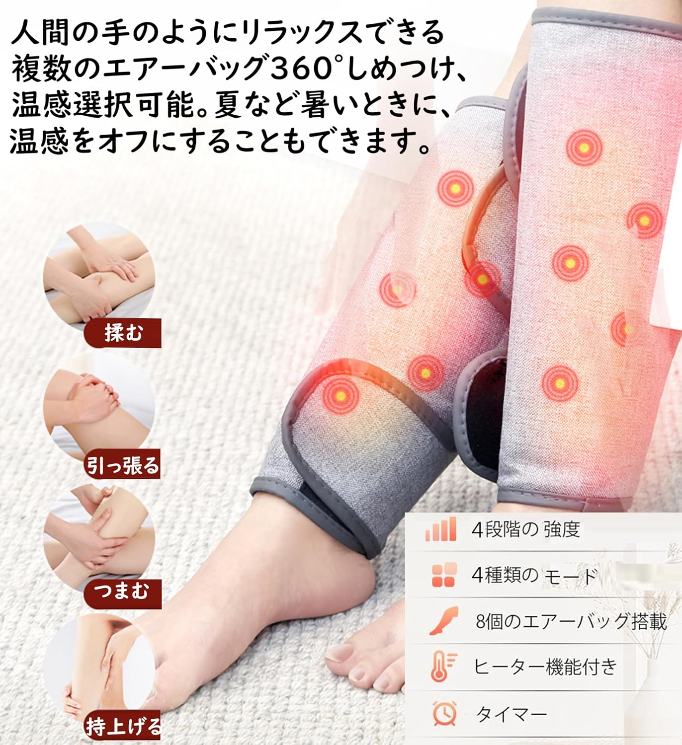コードレスヒーター 4段階強度 4種類モード 3段階温度 ヒーター機能 タイマー 急停止保護