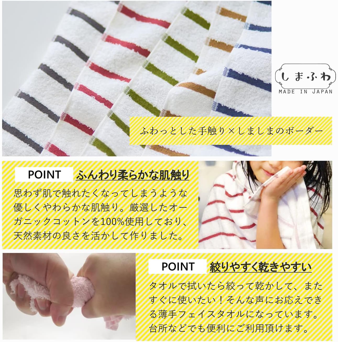 [しまふわ] ボーダー オーガニックコットン 瞬間吸水 速乾 乾きやすい 部屋干し 綿100% 220匁 (フェイスタオル, 5色アソート)