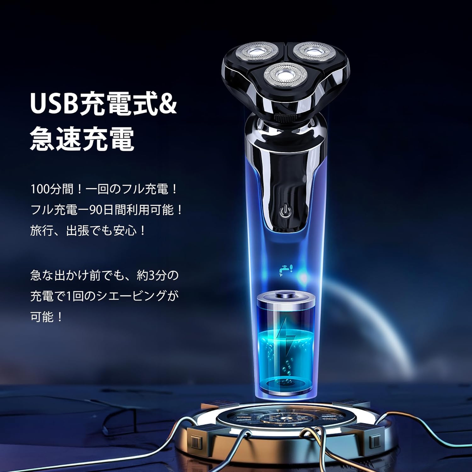 男性用 Type-C急速充電 IPX7防水 水洗い お風呂剃り可