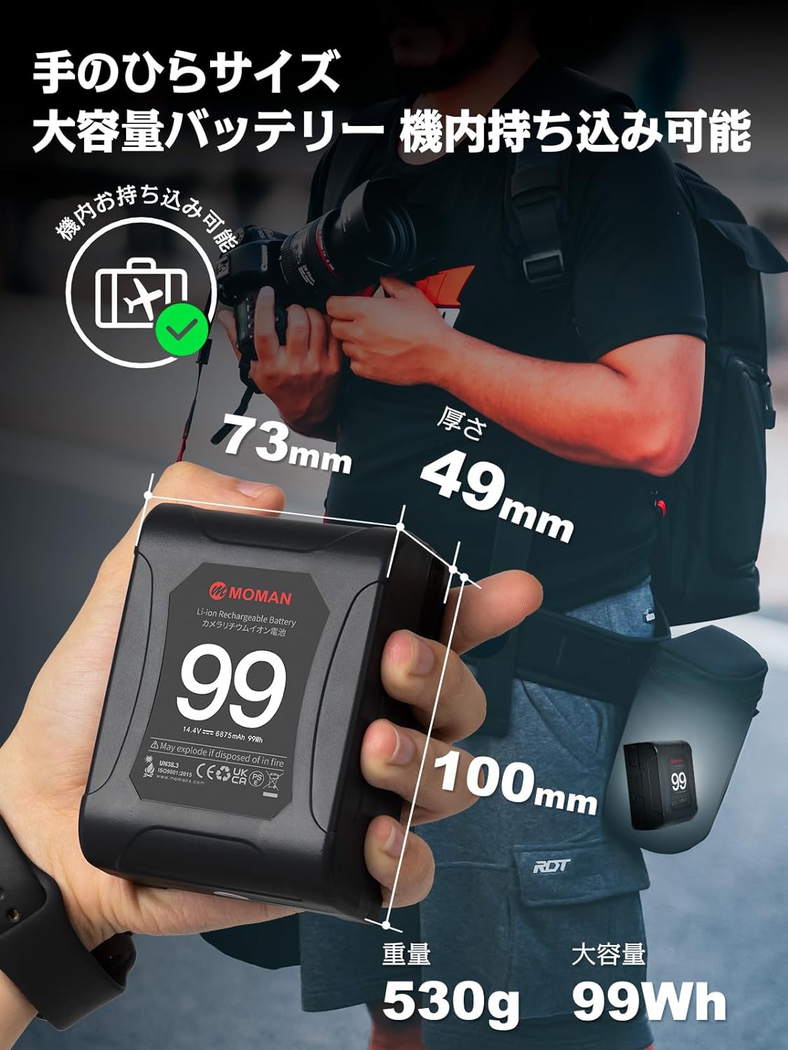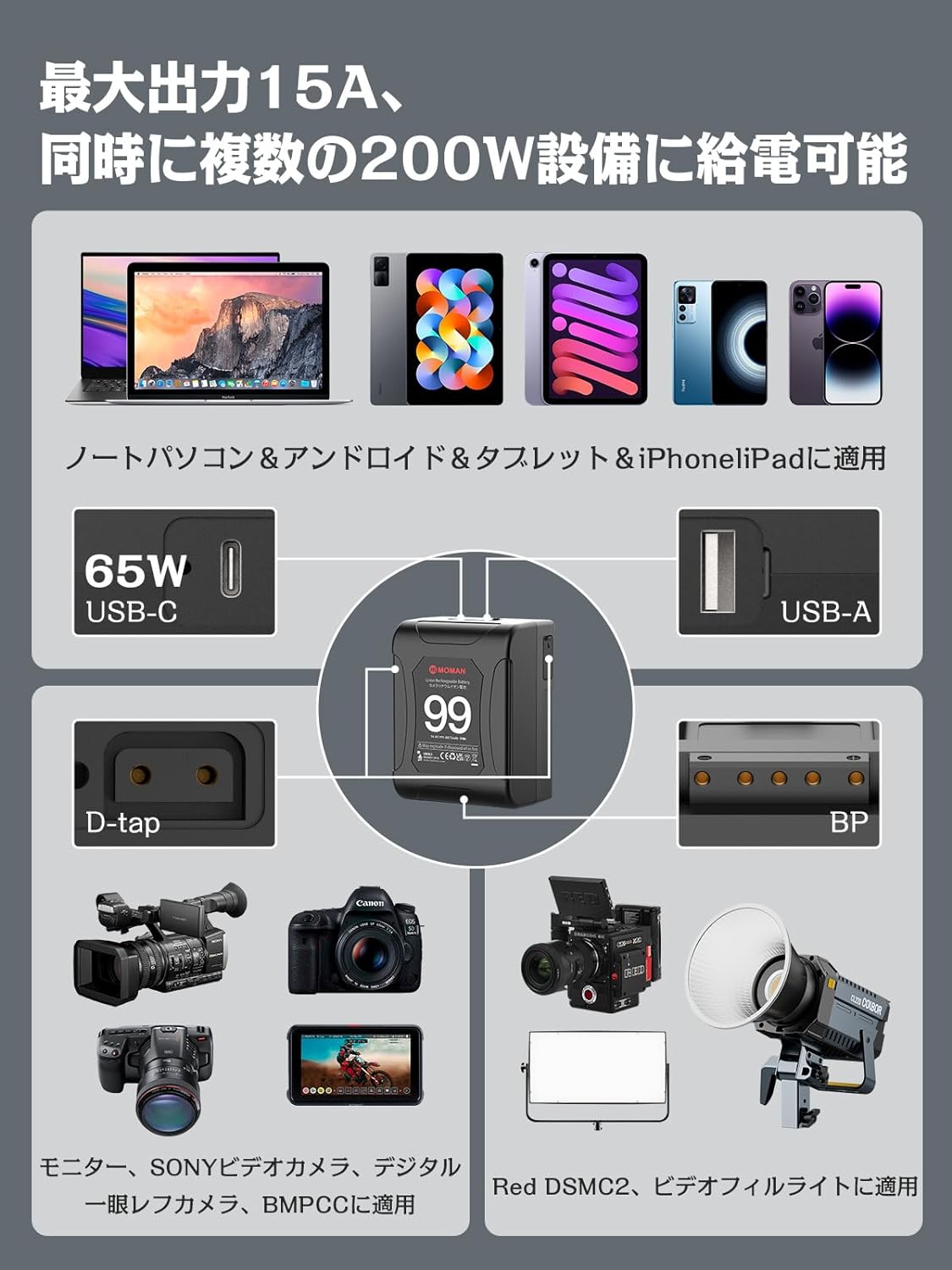 機内持ち込み可能 6875mAh(99Wh/14.4V) ダブルD-tap/USB-C BMPCC 4k/6K PD 65W 出力端子