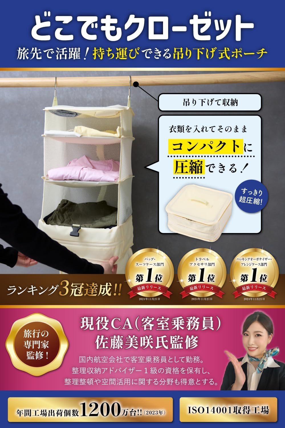吊り下げ YKK クローゼット 収納 旅行 便利グッズ トラベルグッズ 圧縮袋 [LEAGOO] (ベージュ, L)