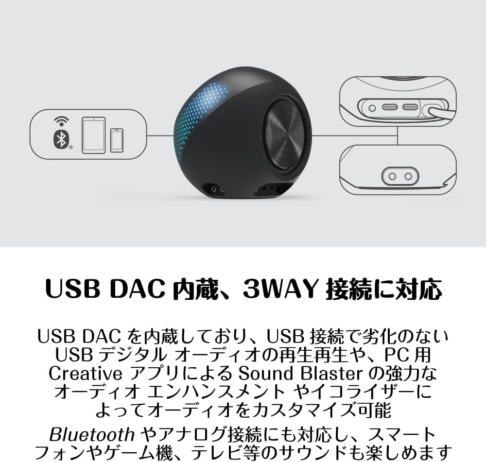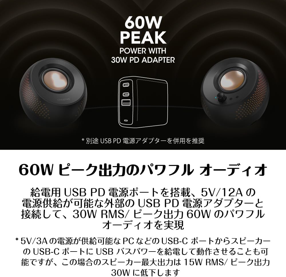USB PDポート搭載 30W RMS/ピーク出力60W PC スピーカー