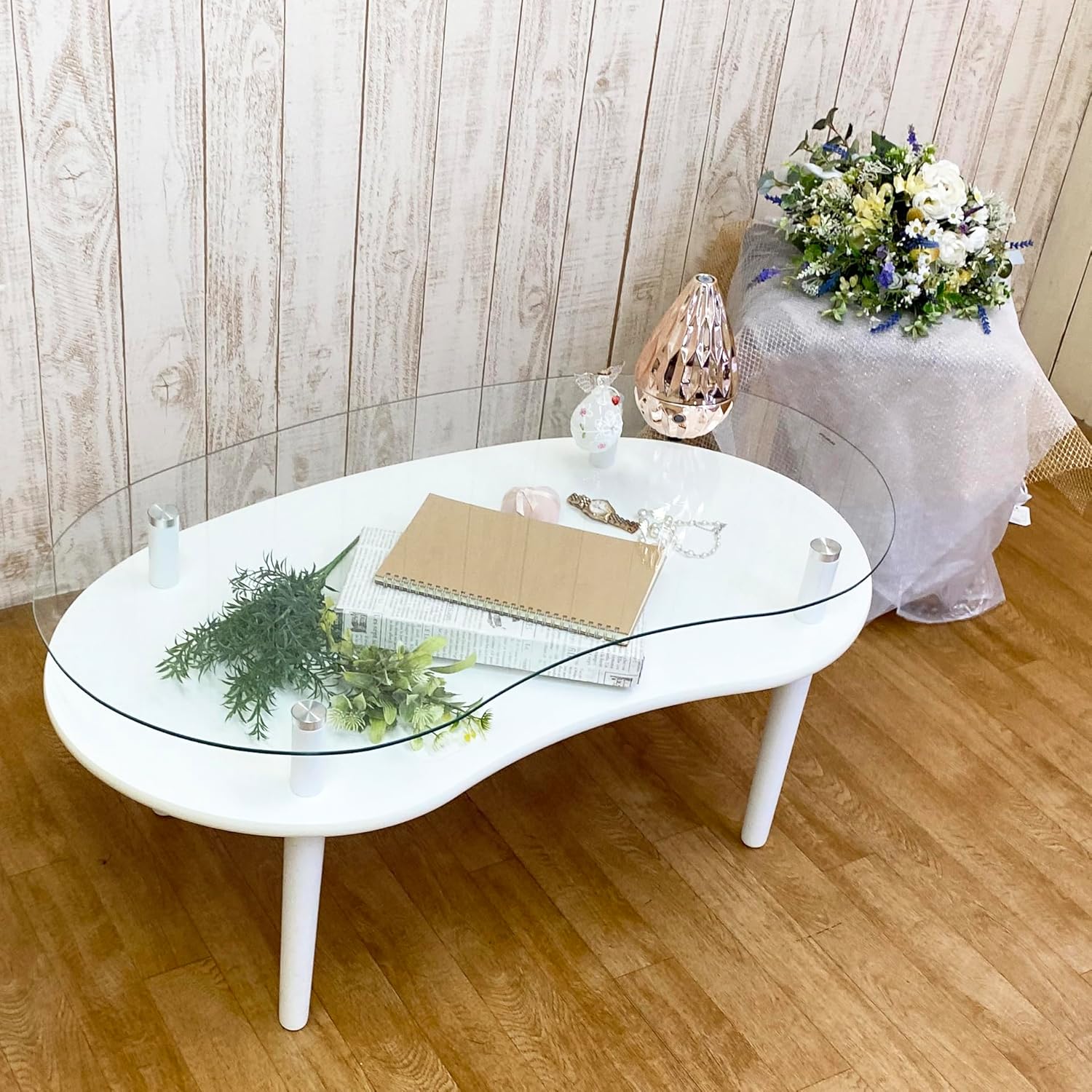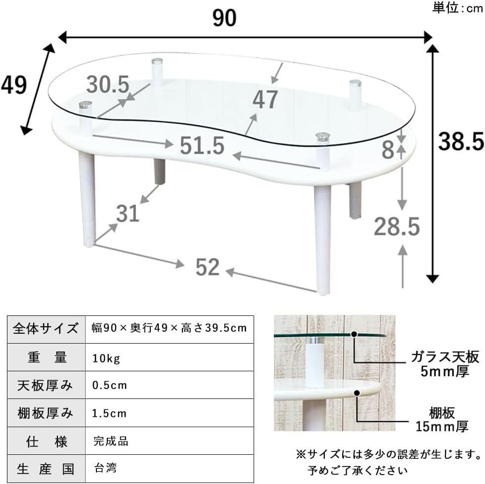 木製 収納 棚 付き 白 ビーンズ 型 ロテーブル センターテーブル 透明 クリア ガラス 天板 木製 デスプレイ 収納棚 付き 幅 90 奥行 49 高さ 39.5 cm ホワイトRG−9039 WH