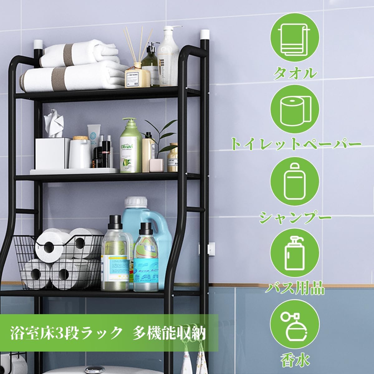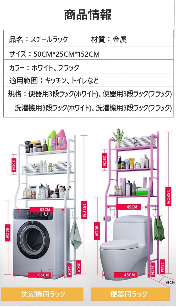 洗濯機上収納 突っ張り式 3段棚 ランドリー収納 トイレラック 置き物架 上収納 トイレ収納棚 多機能 ラック サイドバー フック付き 省スペース 組み立て簡単 サニタリー収納洗剤 掃除 多目的 ランドリー 生活雑貨