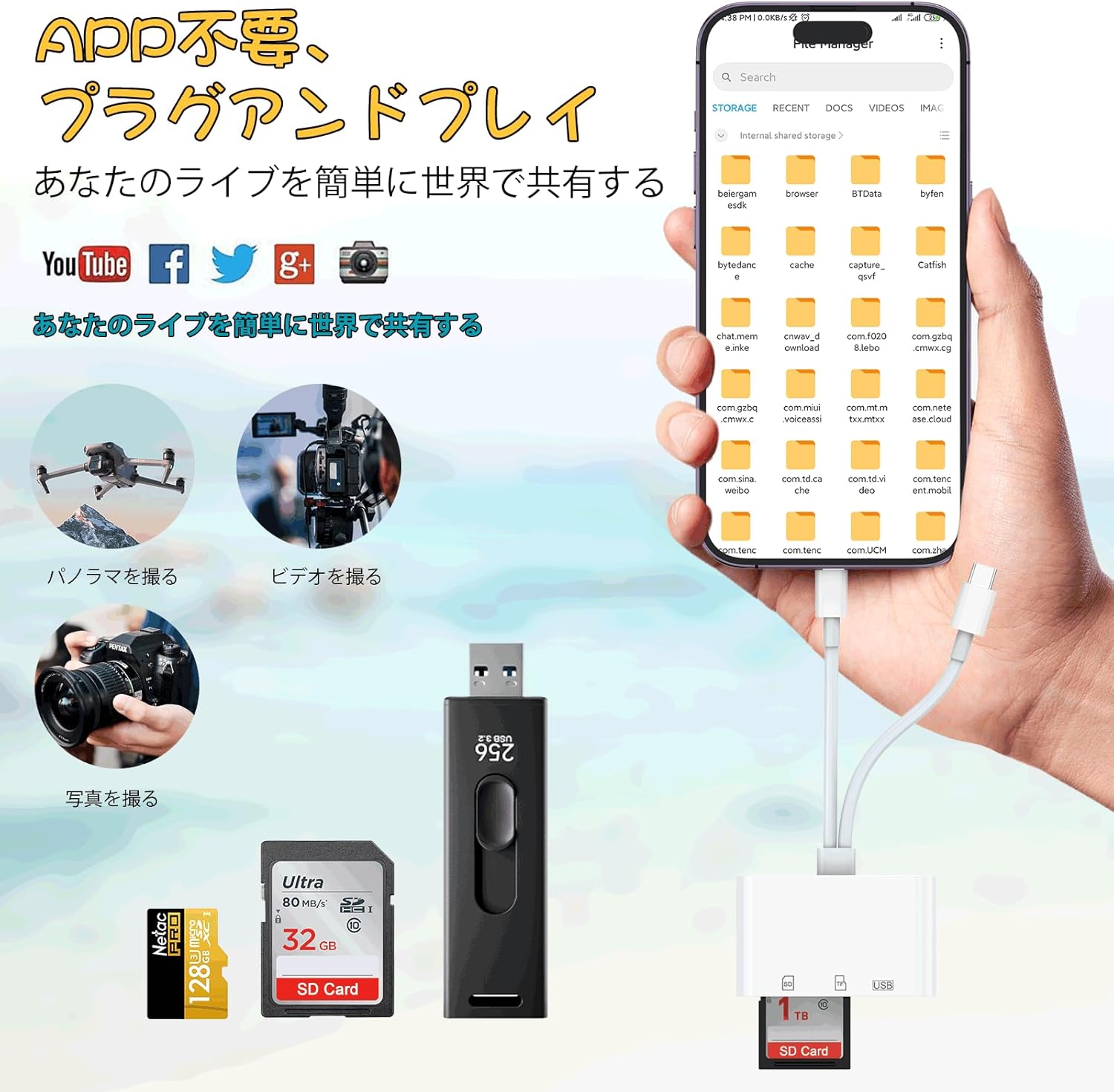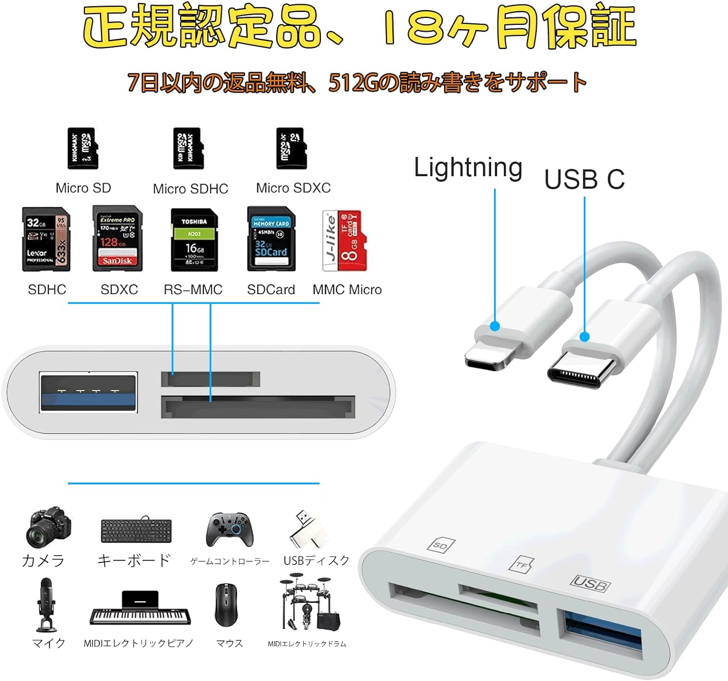 OTG対応 高速伝送 双方向転送 読み書き同時 設定不要 操作不要 日本語説明書付きライトニング カードリーダー SDカード、TFカード、Uディスク、USB周辺機器対応 iPhone/iPad/IOS 対応