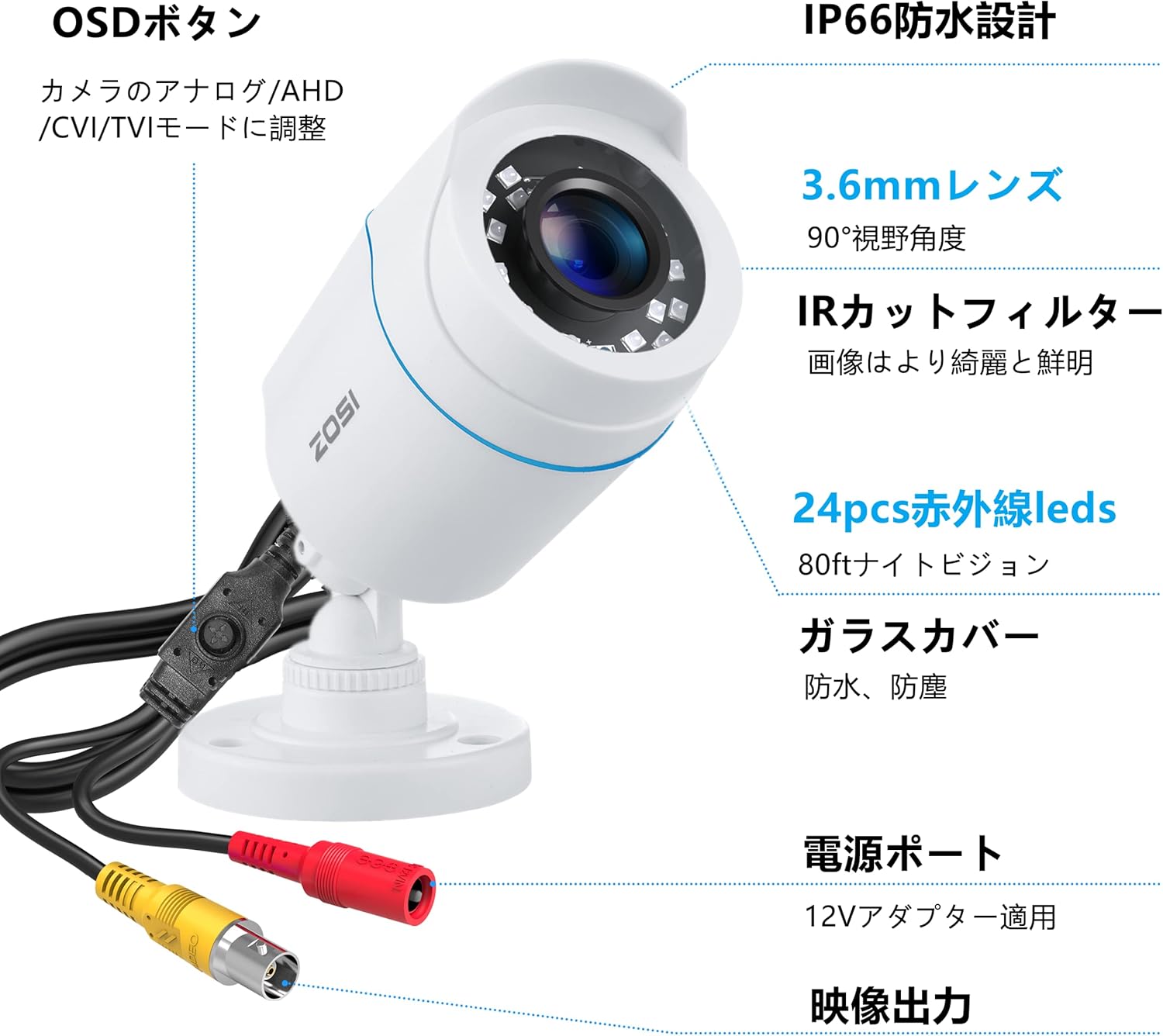 アナログ/AHD/CVI/TVIカメラ 屋内/屋外カメラ 設置簡単 安定した映像伝送 200万画素フルハイビジョン1080P 赤外線24個搭載 暗視機能 3.6MM 90°広角レンズ 電源コード式 IP66 防水防塵 プラスチック製 ホワイト C106